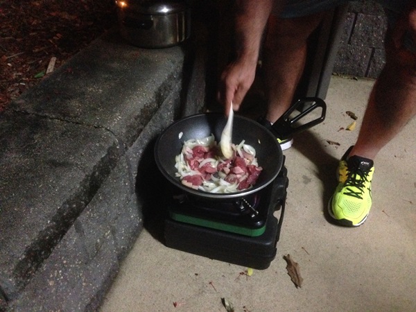 サバイバルナイフを巧みに操り、肉と野菜を切り刻んでゆく。