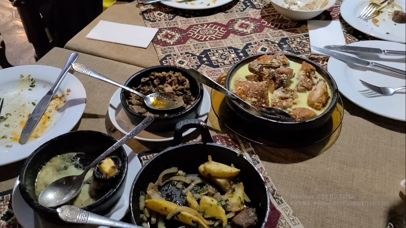 そして夜にはジョージアに住んでいるショーくん(以前『旅丸』という人気ブログを書いていた旅のエキスパート)とアルちゃん(アルトゥール=日本大好きラトビア人)、そして50ccのカブで世界一周中のアルマくんと俺らの6人でショーくんおススメのジョージア料理屋へ!!