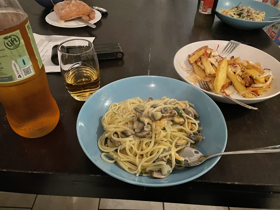 仕事から帰って来たシンちゃんがまたポテトサラダとシーフードパスタを作ってくれた。