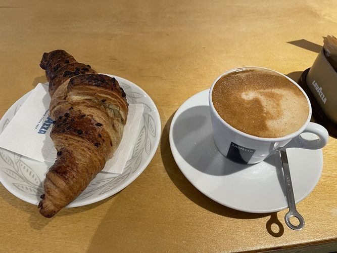 仕方がないので動画の編集に取り掛かり、飯にも行けないため下のバーでパンとホットミルクで昼飯。