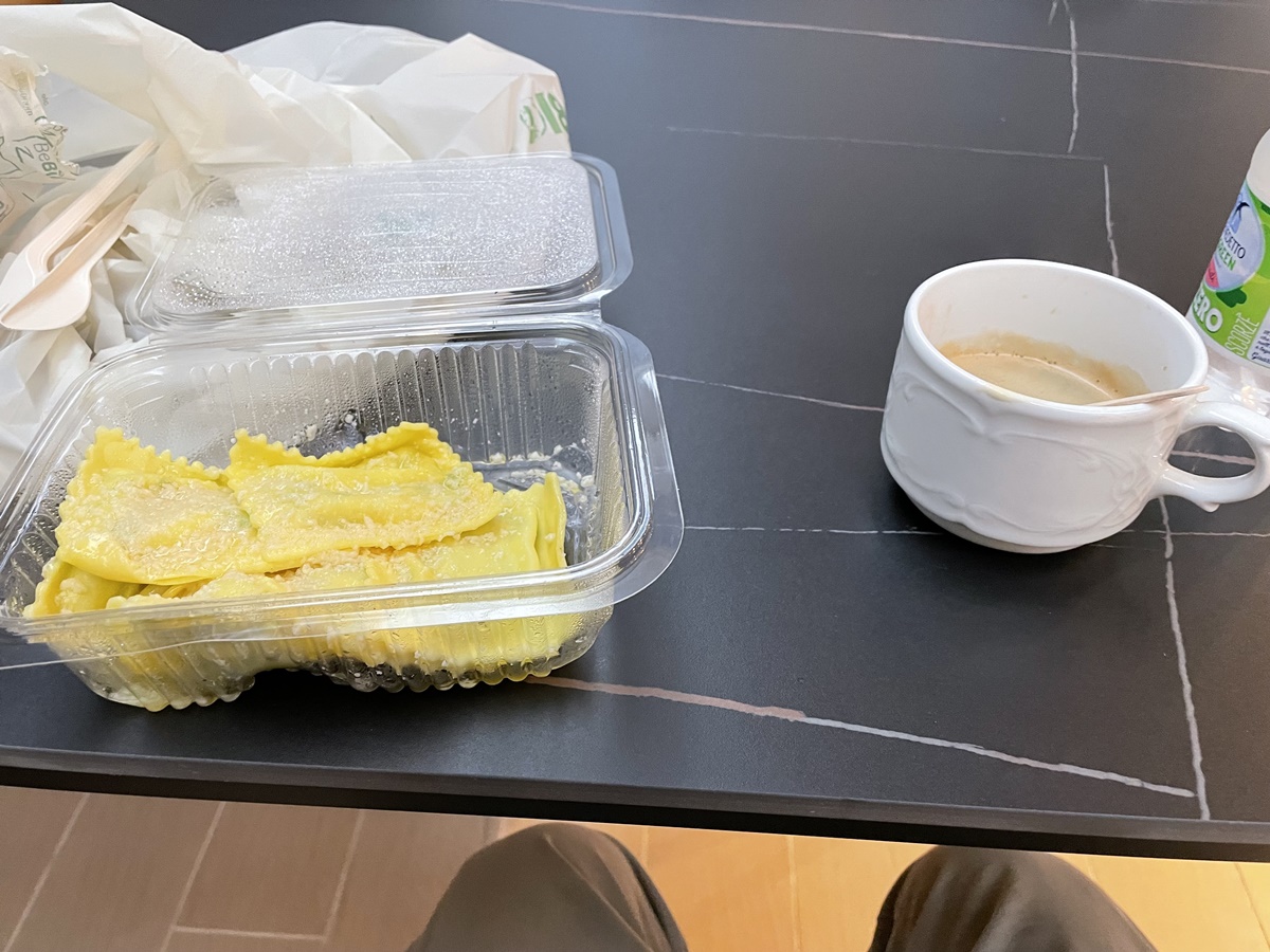 荷物を置いて一旦外出し昼飯にラビオリ?みたいなヤツを買って戻る。