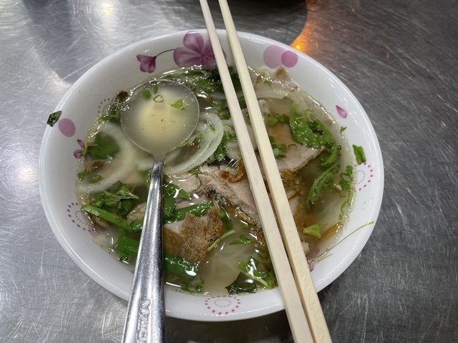 散歩がてら話をしながらベンタイン市場方面まで歩き、市場の向かいにあったお店でフォーを食べる。