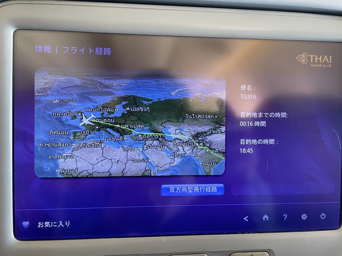 長時間のフライトだがタイ航空なので座席にはモニターが付いており、映画鑑賞やゲームも可能となっているので暇つぶしはできそう。