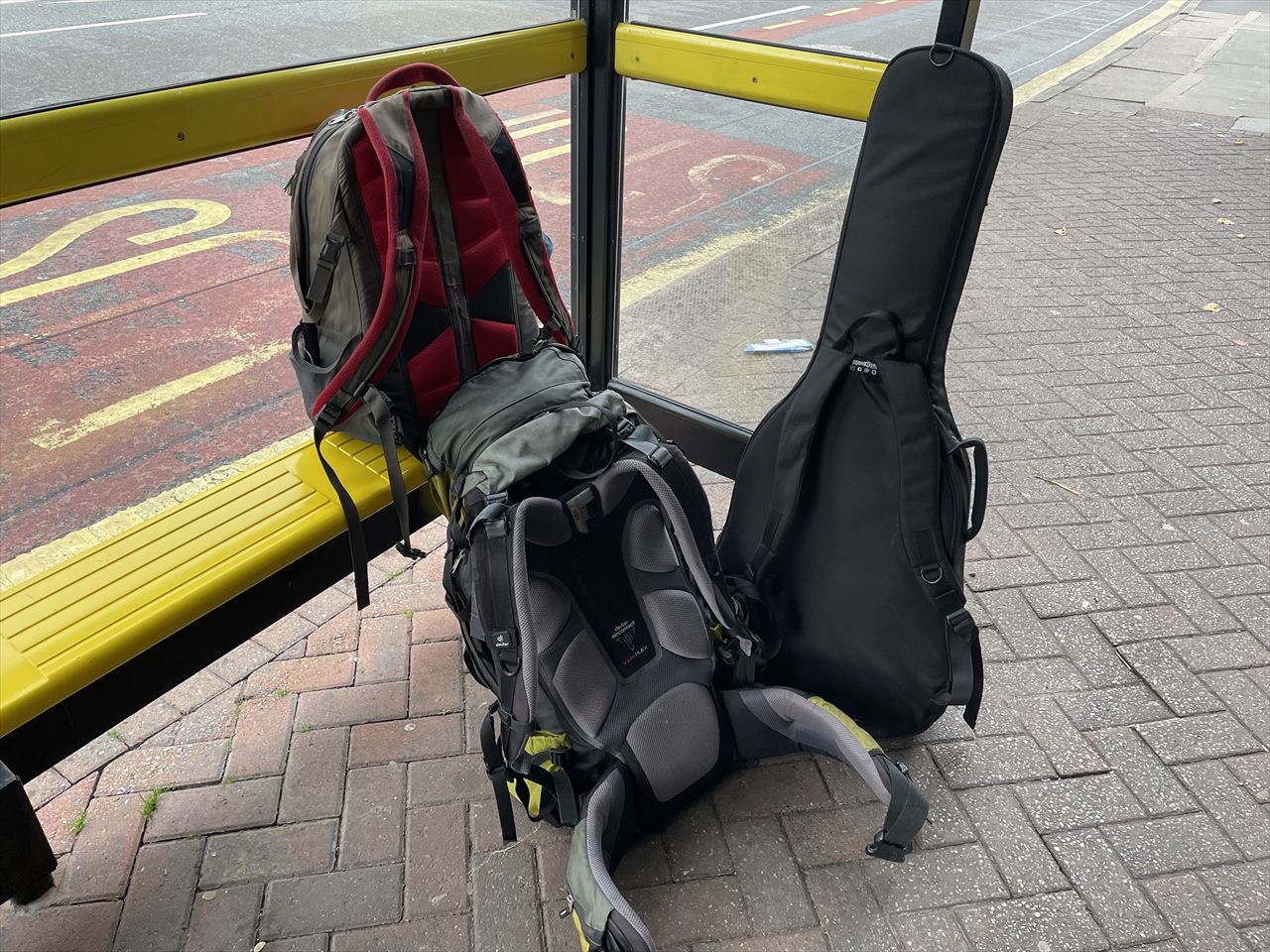 庇のあるバス停なので荷物を置き、余裕たっぷりにタバコを吸って休憩。
