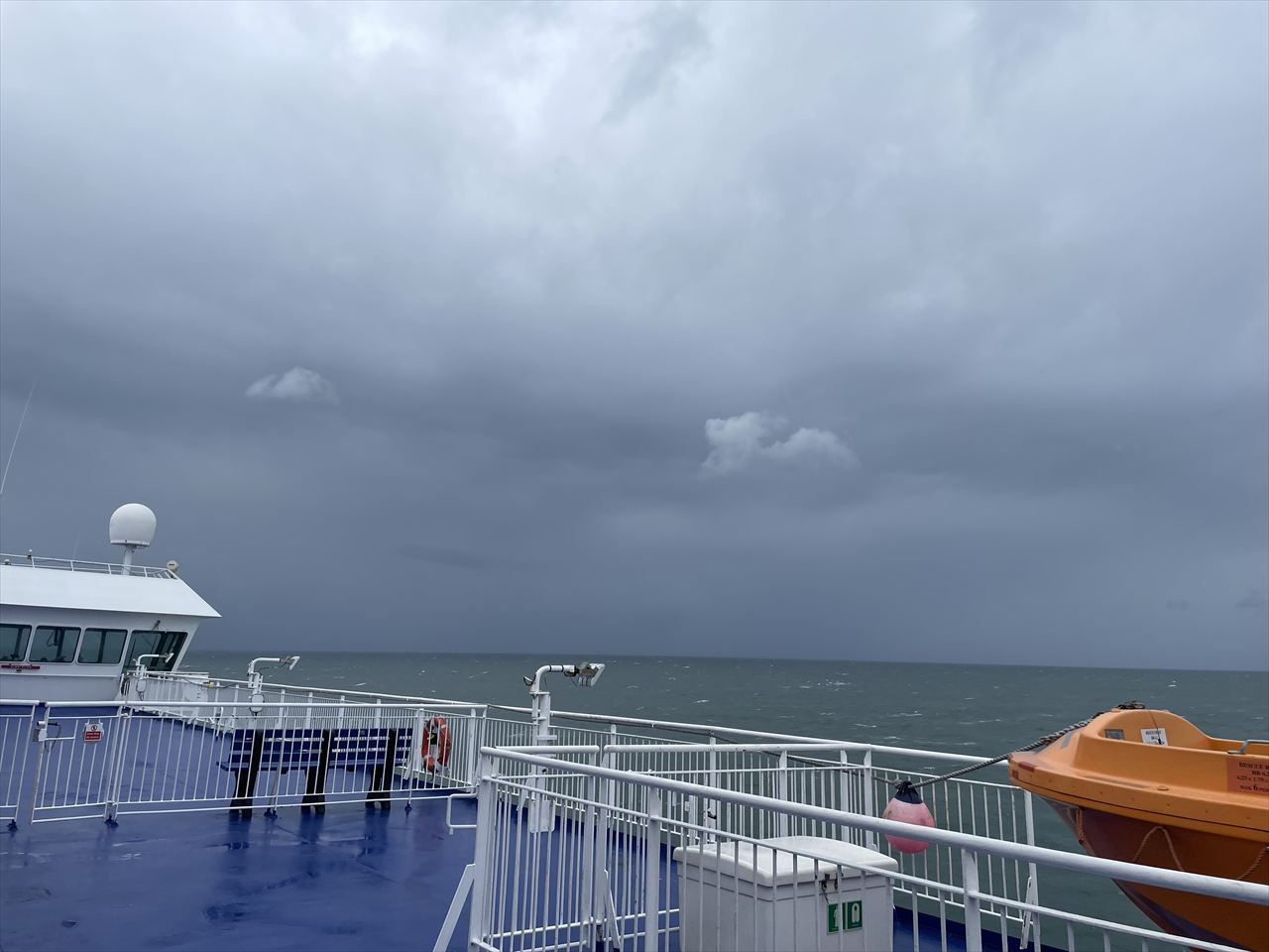 カフェに出来た行列が捌けるのを待つ間に一応船旅っぽい映像を撮ろうとデッキへ出てみたが、雨が混じった吹き荒れる風に阻まれてかろうじてタバコを一本吸って船内へ戻り、ようやく人がいなくなったカフェに行って両替を頼むと断られるという大して実りのない時間を過ごす。