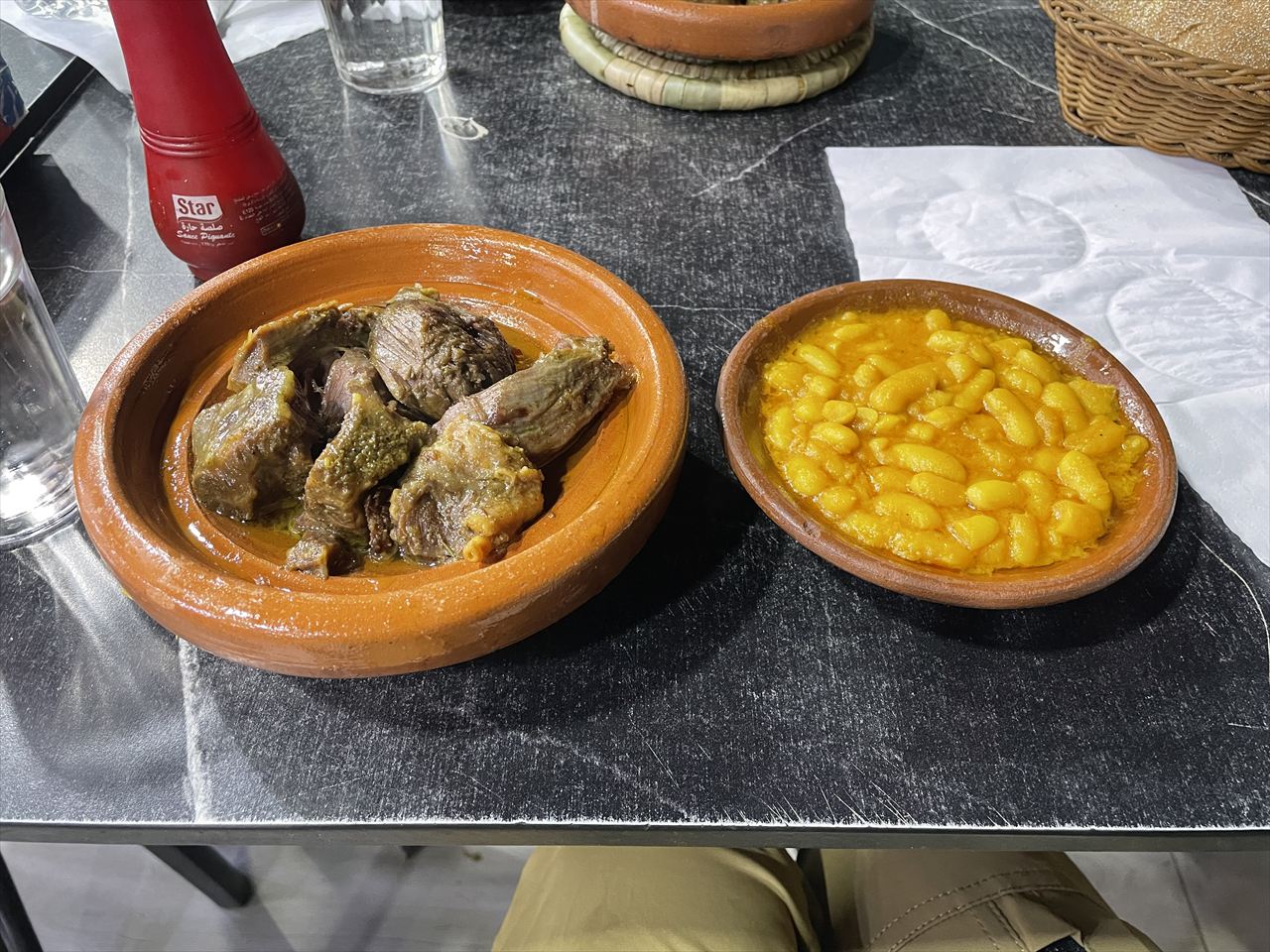 牛肉や羊肉をニンニク、スパイス、塩レモンなどと一緒に煮詰めた味の濃い郷土料理でとても美味しい。(45ディルハム、他の料理より少し高め)