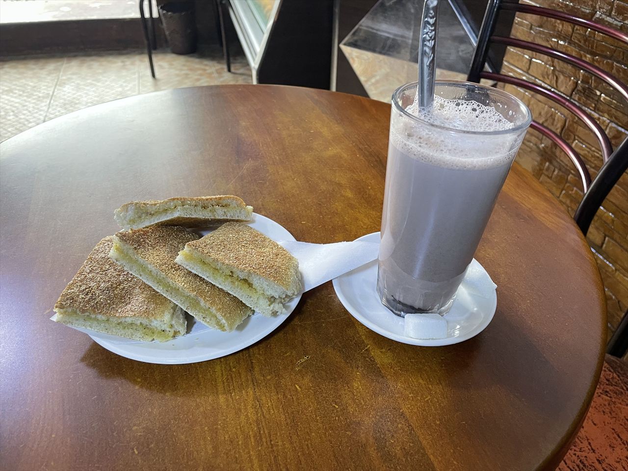 メディナの麓のカフェでハニートーストとホットチョコレートで朝飯。