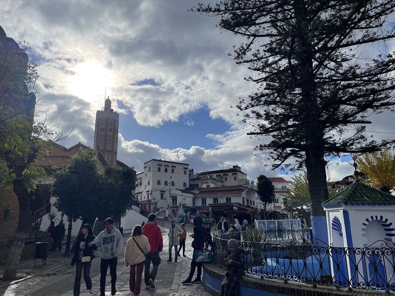 今日はサッカーのアフリカカップのモロッコ代表の試合があるらしく、広場に設営された大型のスクリーンで放映されている試合を観戦するために人々は傘を片手に広場に集合していた。