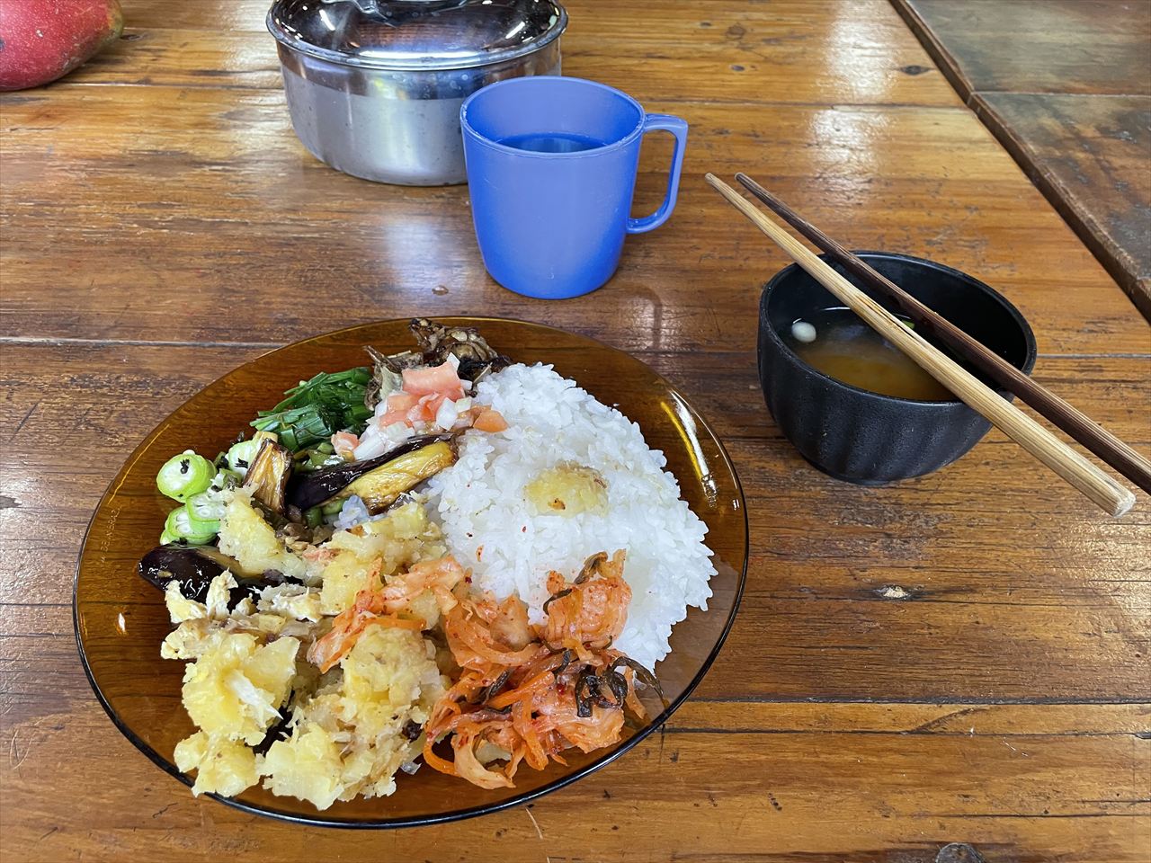 中央にある食堂の外へ荷物を置かせてもらってさっそく朝御飯をいただけることに。